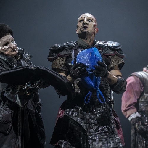 Le « Munstrum théâtre » s’empare du Macbeth de William Shakespeare avec un K – MaKbeth. K comme Kafka, K comme Kaos, K comme Kaputt, K comme Katharsis peut-être… K c’est en tout cas la signature revendiquée de cette libre adaptation, et la marque de la monstruosité dont est porteuse la tragédie la plus noire du dramaturge élisabéthain (1606). Louis Arène et Lionel Lingelser – duo fondateur d’une compagnie qui a reçu deux Molières en 2024 pour un spectacle d’anthologie 40° sous zéro consacré à Copi – incarnent le couple démoniaque de la pièce, entraînant tous les personnages dans une virée terrifiante et grotesque au pays du mal. Dans un jeu très physique, les acteur·ices sous leurs masques, sont transformé·es en créatures étranges par d’étonnants costumes, dont les pouvoirs de métamorphose vont de pair avec l’art le plus ingénieux de la récupération. L’exubérance du spectacle, la puissance de ses effets caractérisent l’esthétique de ce fascinant théâtre d’images.